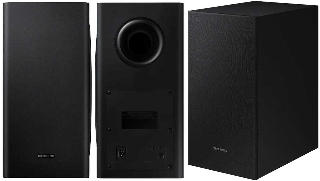 Samsung HW-T450 is a budget soundbar with 2.1 sound scheme. The model is the successor to last year’s HW-R450 soundbar. Unlike more expensive models, the Samsung HW-T450 soundbar body is made of thinner plastic.
