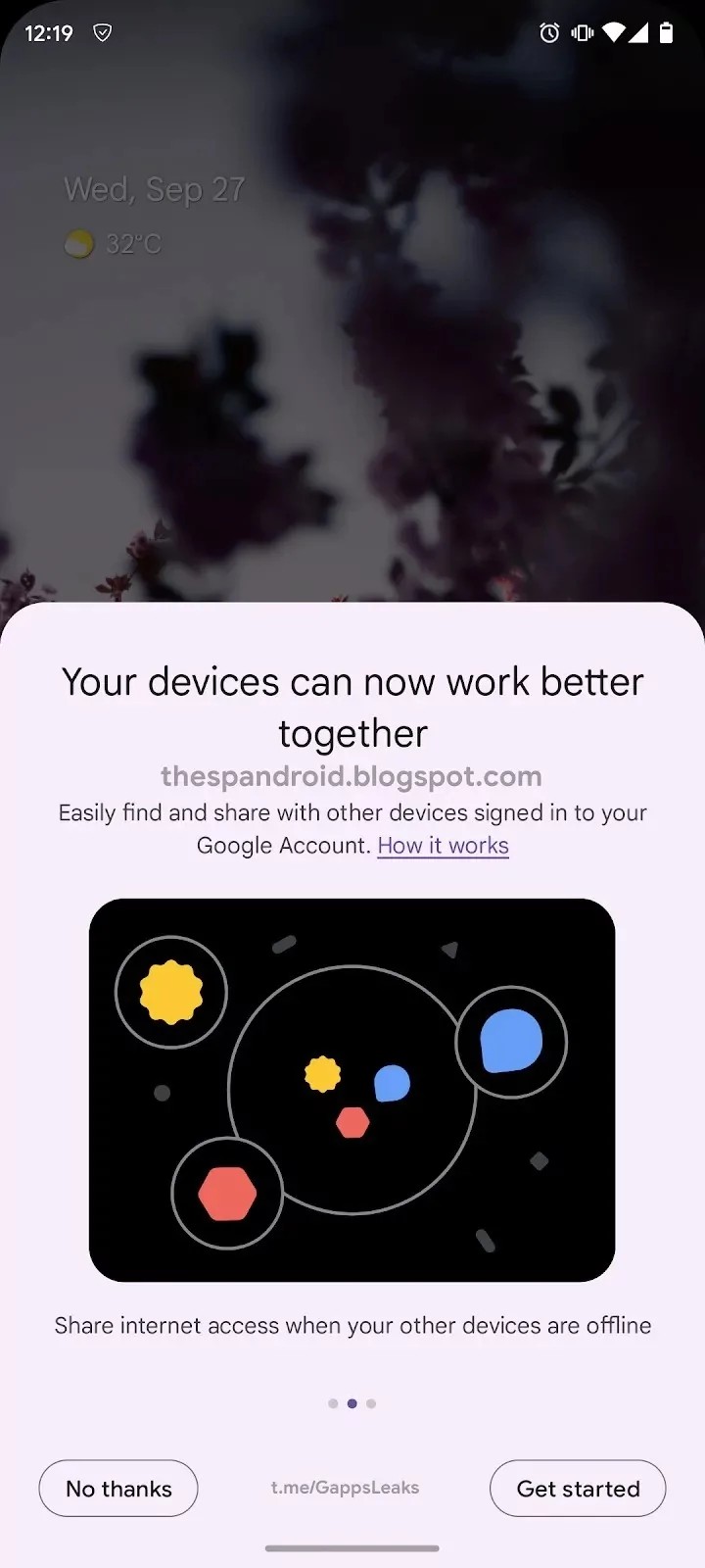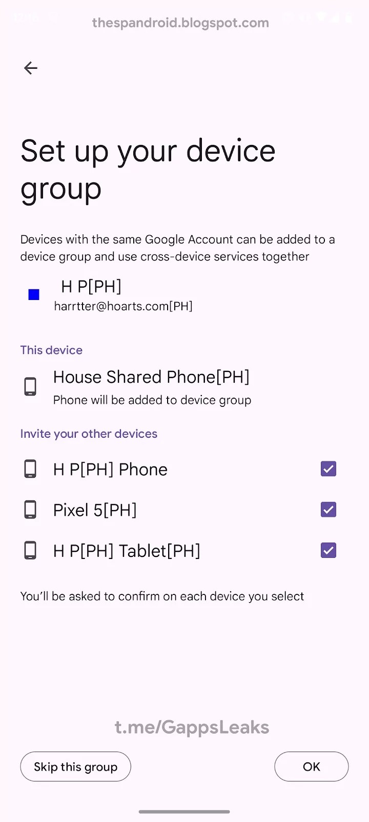 Apparently, users will be able to add devices to a group, united by a common Google account. A pop-up window before initial setup displays two options for using this feature. One is the ability to forward an active video call between devices, and the other is to share internet access when other devices are offline.