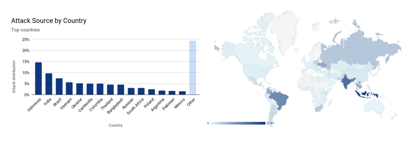 In this specific incident, the traffic originated from more than 20,000 bots in 125 countries around the world. It should be noted that almost 15% of the attack originated in Indonesia, followed by India, Brazil, Vietnam and Ukraine.