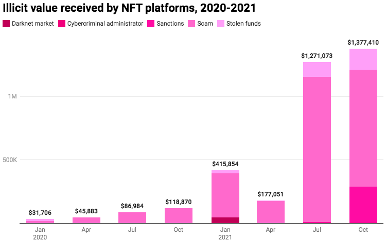 The researchers determined the minimum amount of laundered money by tracking transactions directed to NFT marketplaces from cryptocurrency wallets that have previously been seen to be associated with fraud, malware and other illegal activities. The total was about $1.4 million in the fourth quarter of 2021 — which may seem like a small amount, but it is more than three times higher than in the first quarter — $415.8 thousand.