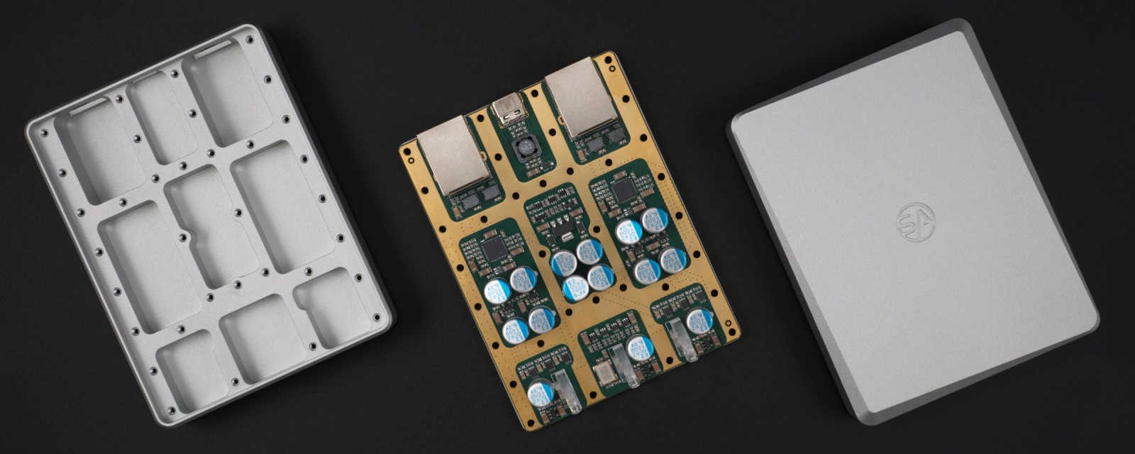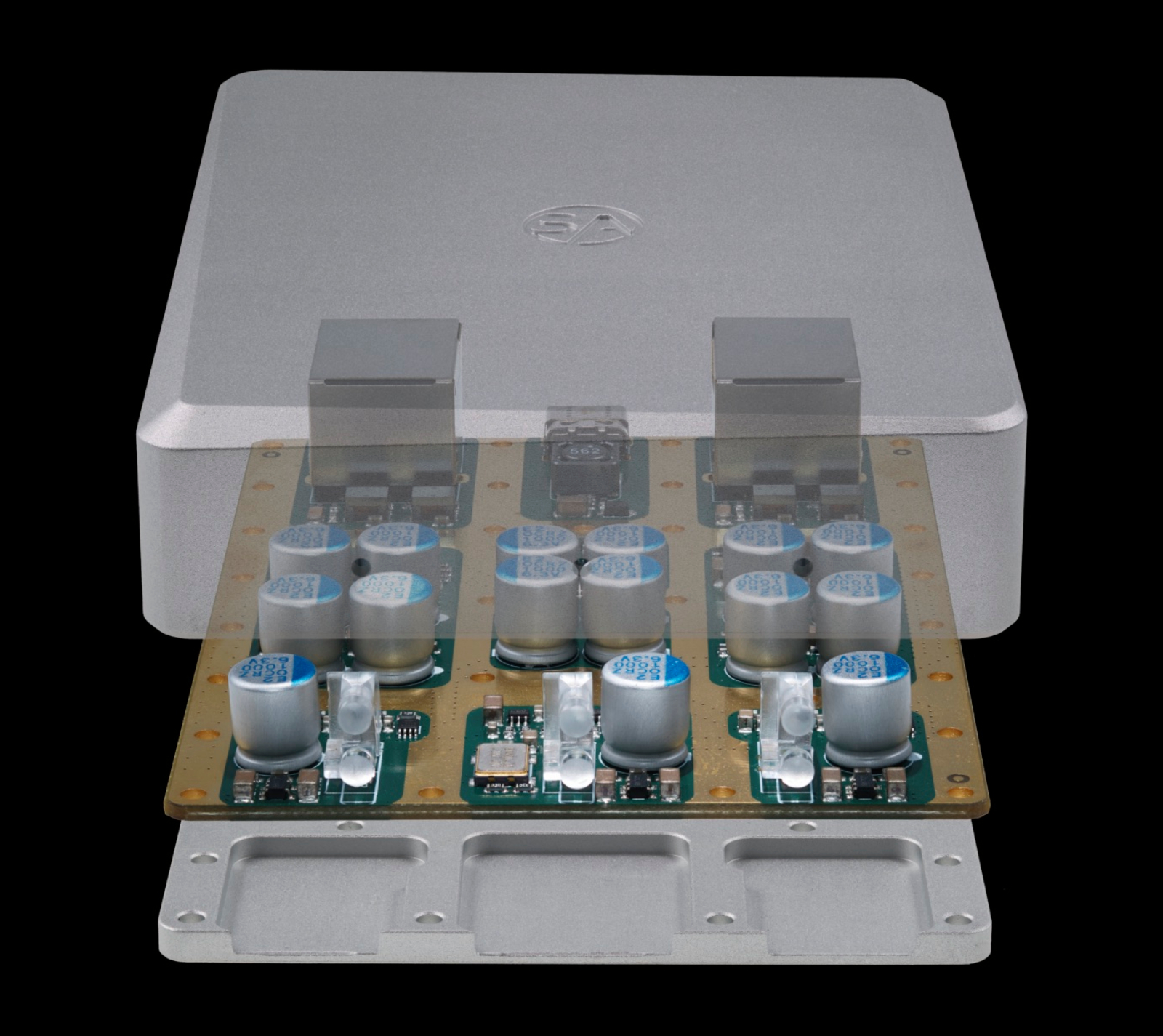 The machined aluminum housing acts as an RF shield, while the compartmentalized internal design isolates circuits to minimize crosstalk. Gold-plated ground paths further reduce noise, ensuring pristine audio quality. The SmoothLAN Regenerator features a custom power supply with multi-stage filtering and active regulation for stable performance with extremely low noise.