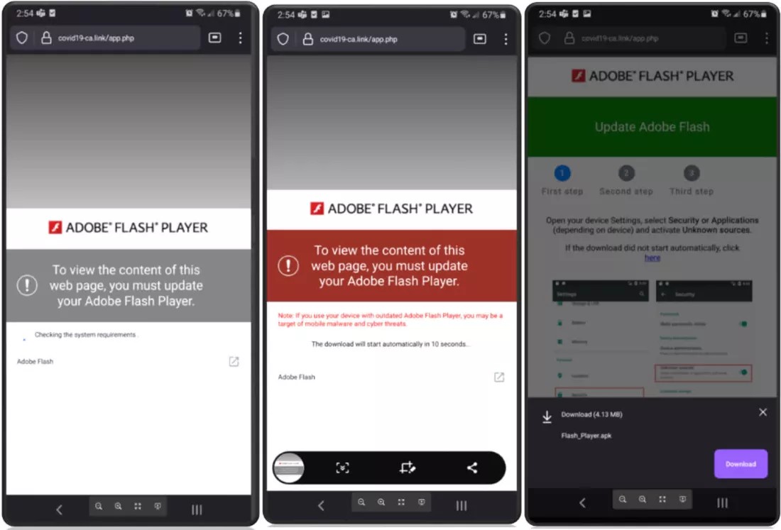 It indicates that an update to Adobe Flash is required. When interacting, users are faced with the fact that malware is downloaded to the smartphone. Attackers hope that naive people will not pay attention to the fact that Flash support was discontinued in December last year, while it has not been working on mobile devices since 2012.