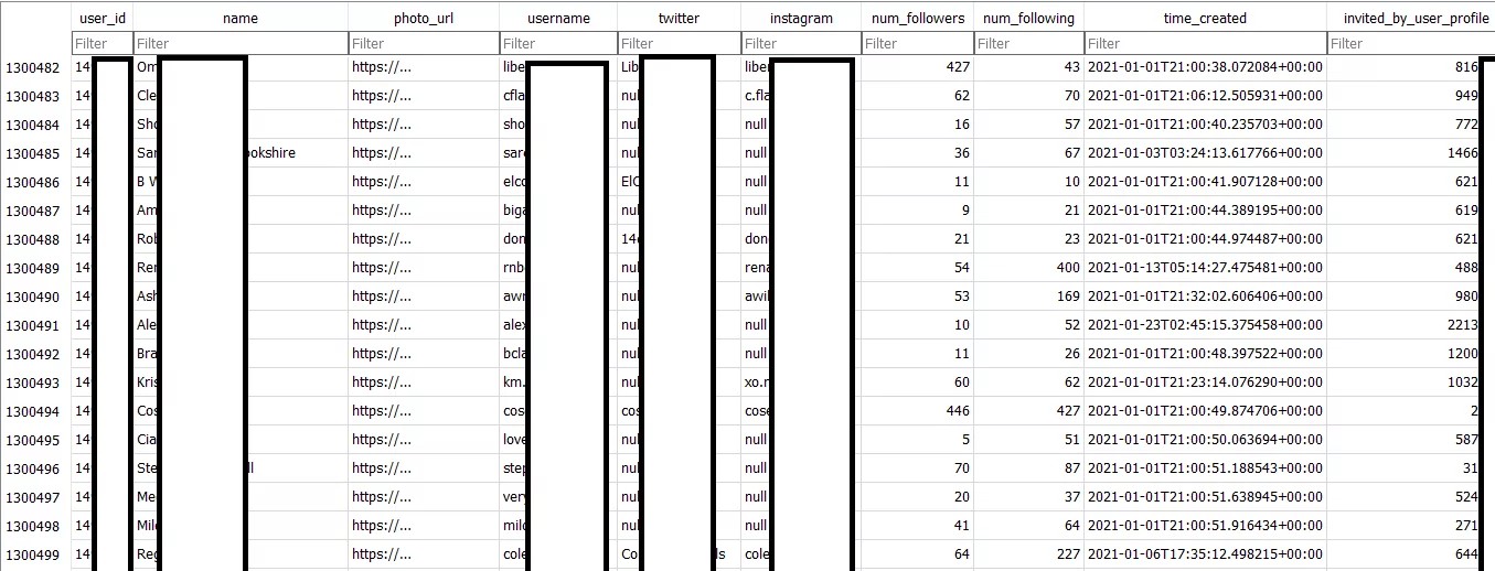 The database contains usernames and IDs, profile photos, account creation dates, number of subscribers and subscriptions, IDs of inviting users, information about linking Twitter and Instagram accounts.