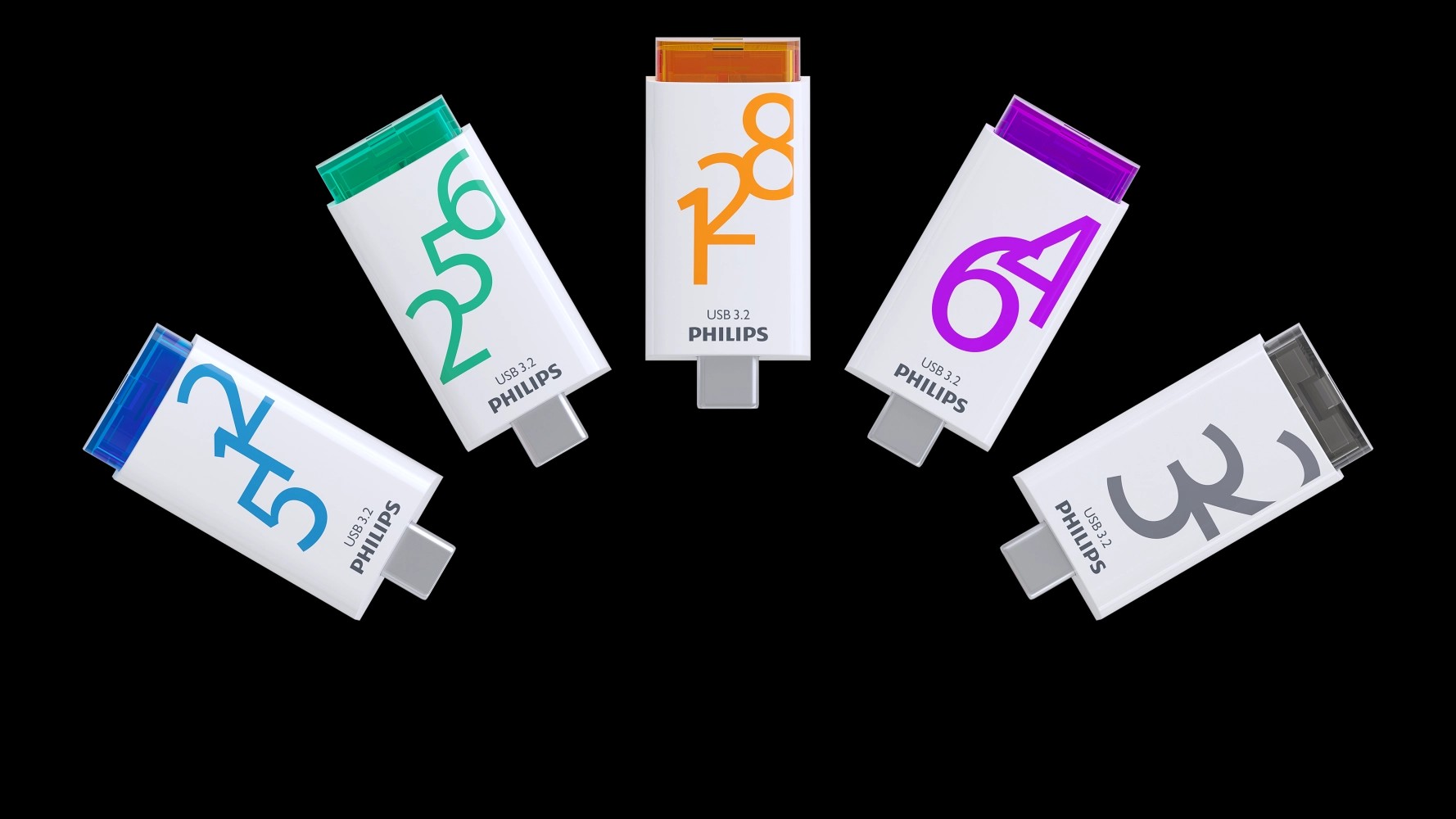 The Philips Click sticks are available with a capacity of 32 to 512 gigabytes. They are not very subtle in size, but it is useful that the plug can disappear into the stick as desired. It is also nice that each storage capacity has its own color in the print. Moreover, the print clearly indicates how much space the stick offers. These are all things that not every memory stick offers.