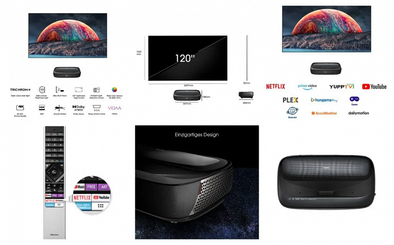 The new laser TV runs under the operating system VIDAA. Weight with stand is only 11.2 kg. TV buyers receive a 4K Fire TV Stick Max and a 3-year warranty.