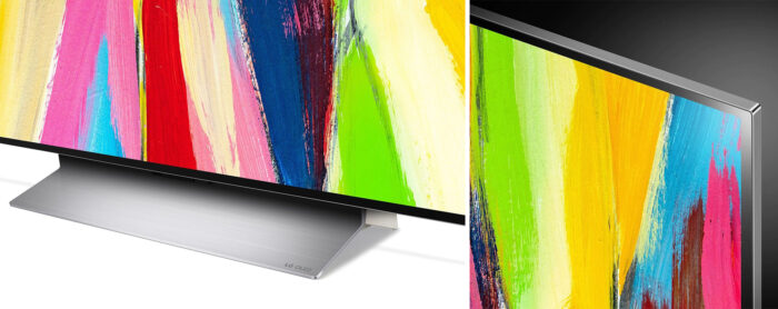 The appearance of the new LG OLED55C2 TV is defined by the same design as the C1, albeit slightly modernized. The frame is now even thinner – reduced from 10.2 mm to 6 mm. The C2 series has a pedestal stand. For the first time ever, the 42-inch model comes with a pair of narrow legs.