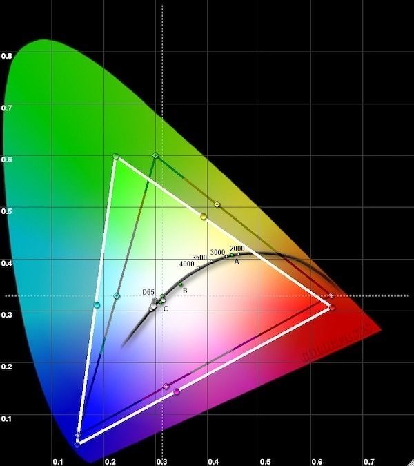 The color gamut is wide enough, approximately corresponds to the DCI-P3 standard in terms of area, but its shape changes greatly not only depending on the selected temperature (which is normal), but also on the area of the output color fields. That is, the more green in the frame, the brighter it is, and the less – the more saturated it is.