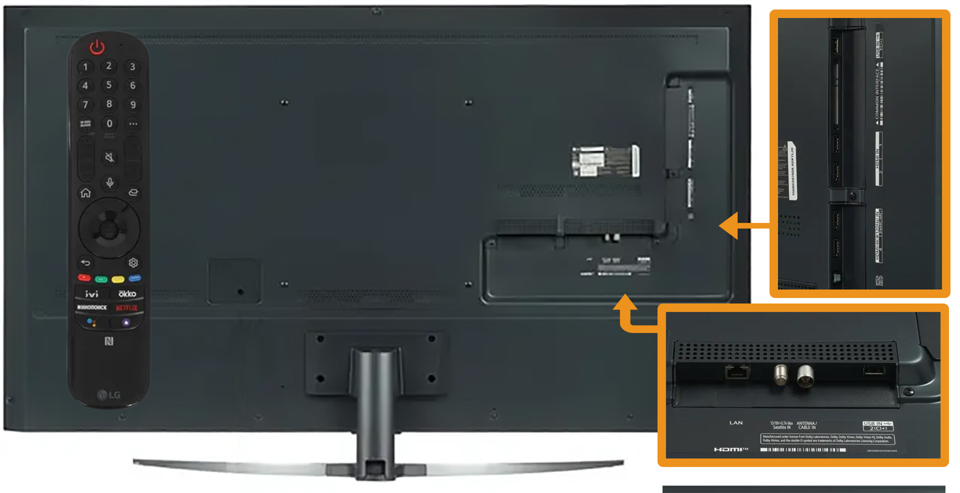 The switching capabilities of the TV are extensive. These are 4 HDMI ports, two of them are version 2.1, one is with eARC support. This and two USB connectors. Further, there is a digital optical audio output, a LAN port for connecting to the Internet, a CI card slot for pay channels and two antenna jacks. Wireless communication is provided by built-in Wi-Fi and Bluetooth adapters.