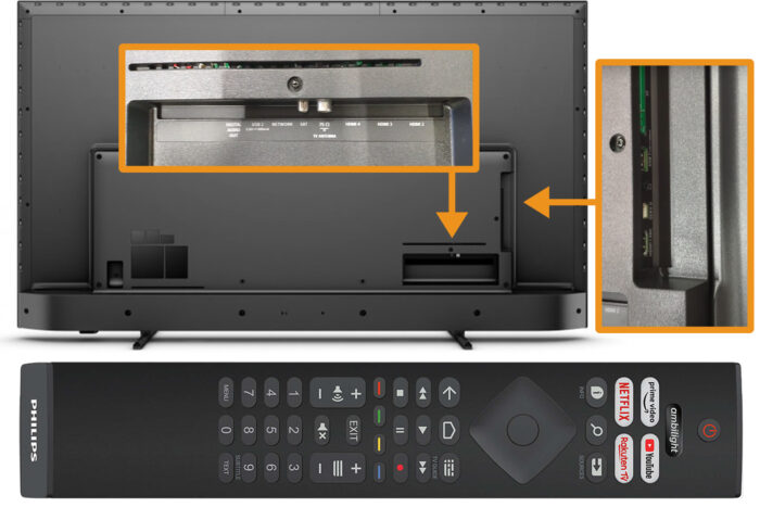 The list of switching capabilities of the Philips 8007 is both extensive and quite standard. There are 4 HDMI connectors on board: 2 version 2.0 (one of them supports ARC), 2 – version 2.1. USB connectors – 2, and both versions 2.0. There are two antenna jacks for terrestrial and satellite dishes, a digital optical audio output, a common interface slot, a LAN port, and a headphone minijack. There is dual-band Wi-Fi and Bluetooth 5.0.