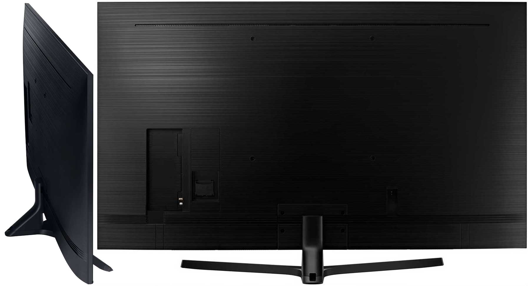 Despite being made entirely of plastic, the AU7500 looks extremely modern and durable. A slim titanium gray bezel complements the design. Thanks to its shallow depth and slim design, it is also ideal for wall mounting. Moreover, most of the cables are routed to the side.