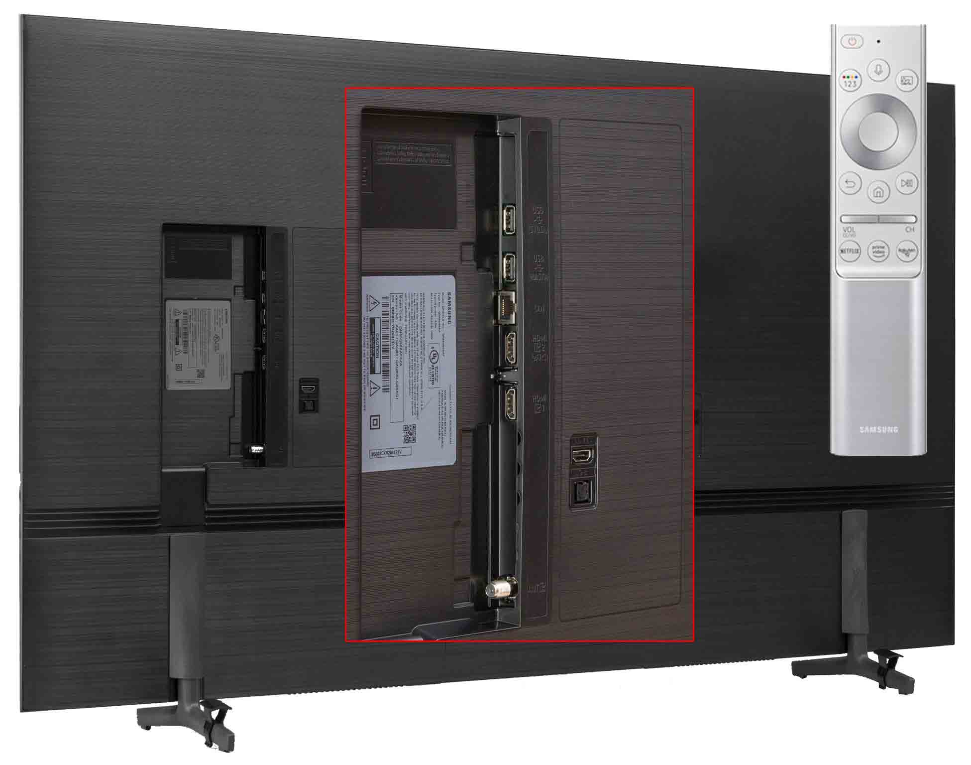 The screen of the QE55Q67A TV is bordered by a plastic frame about 1 cm wide. The back part is also plastic with a matte horizontal texture. All inputs are to the side except for one HDMI port and digital optical audio output. For the installation of cable connections, there are special tracks and clamps on the legs of the delivery.