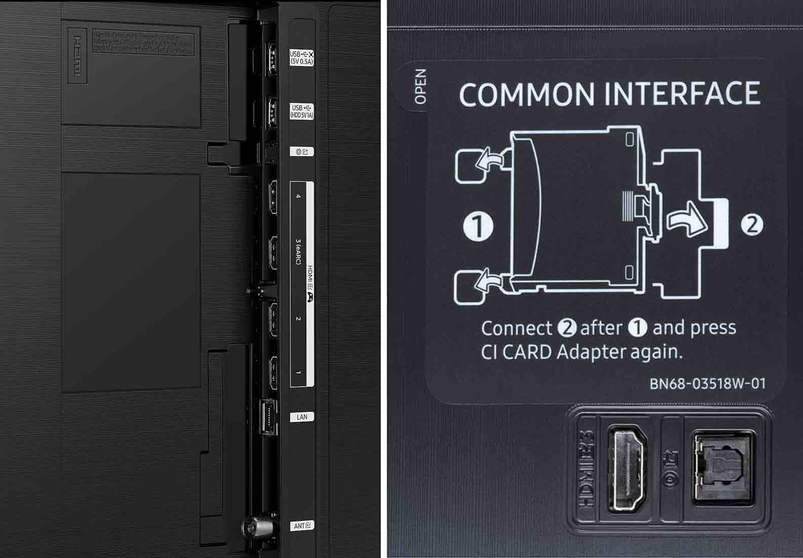 The Samsung QE55Q70C TV is well equipped with four HDMI 2.1 connectors. They offer full bandwidth HDMI 2.1 (48Gbps) and support eARC (on HDMI 3), ALLM, 4K120 and VRR. There are two USB ports, an optical digital audio output, an Ethernet network port and antenna inputs.