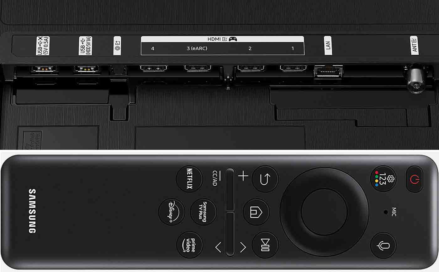 The Samsung QN85C TV comes with two remote controls. One of them resembles a conventional remote control with many buttons. The other remote is sleeker, with fewer buttons and a built-in voice mic. This second smart remote is solar powered, eliminating the need for any other batteries.