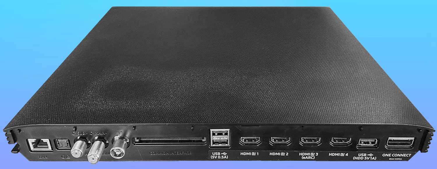 Perhaps the best news for gamers is the 4 x HDMI 2.1 ports at 40Gbps. Through the third HDMI port in the One Connect box, it is possible to implement the eARC option. Other connections include three USB ports, Wi-Fi, Ethernet line-in, Toslink, antenna inputs, pay-channel slot, and Bluetooth.
