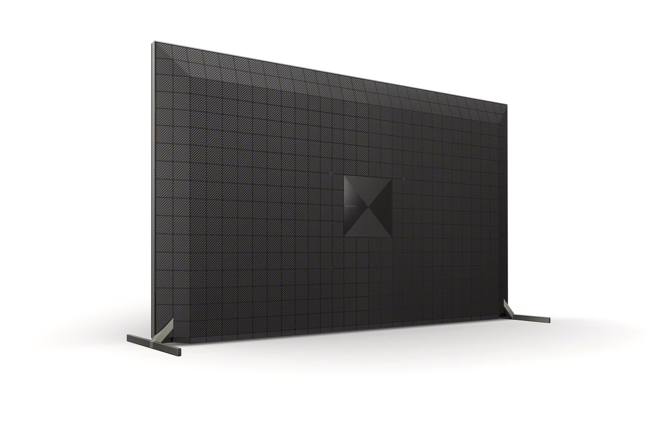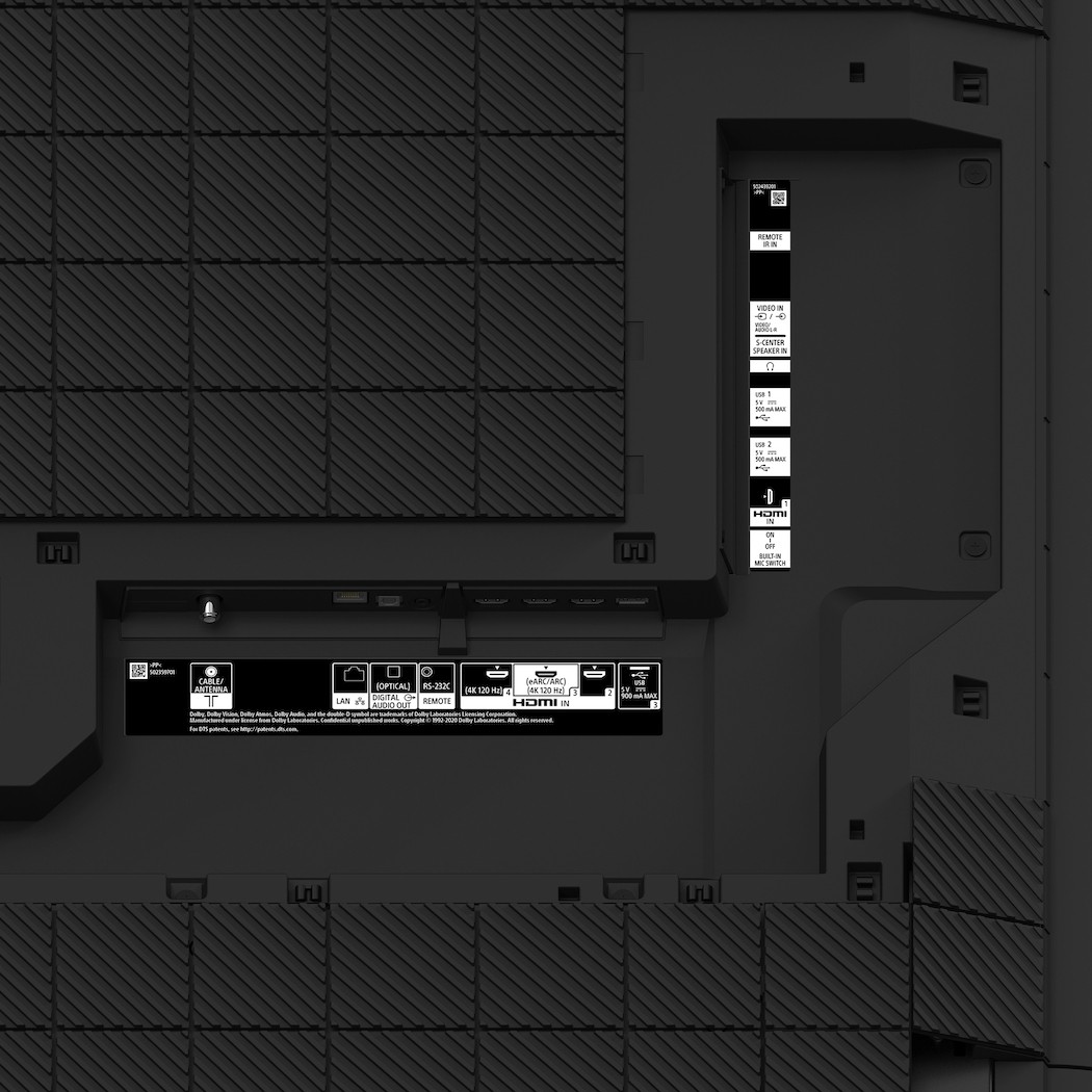 The back of the XR-65X95J TV case is made in a kind of embossing. The stamp of the case is a grid pattern of squares, in the center of which is a large square with the BRAVIA logo. The lower left corner of the back of the TV is filled with an interface section. Connections are made down and to the left.