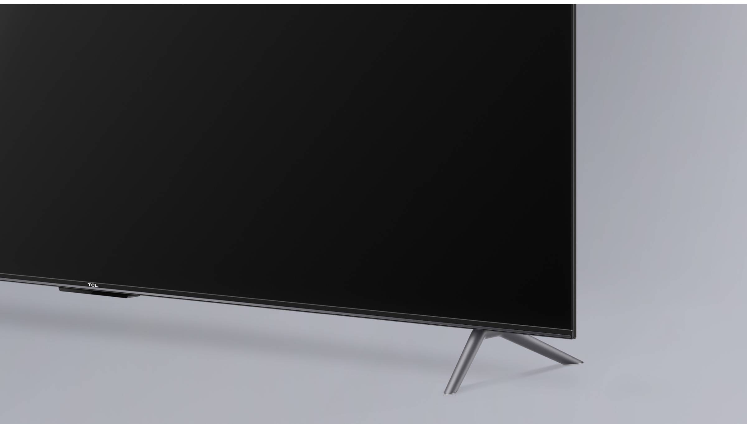 Thanks to the frameless design on three sides, the TCL 65P745 TV does not distinguish between many of its modern cheaper and more expensive counterparts. The model looks pretty decent, so the eye will not be distracted by the case when watching TV. V-shaped legs are spaced almost to the edges of the screen and hold the TV well. But for installation you need furniture of the right size. It can also be installed on the wall.