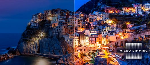 - Micro Dimming . This technology is used to enhance contrast. It is achieved based on an analysis of the image in more than a hundred small areas whose values are changed to further fine-tune and achieve more realistic and defined brightness and contrast.