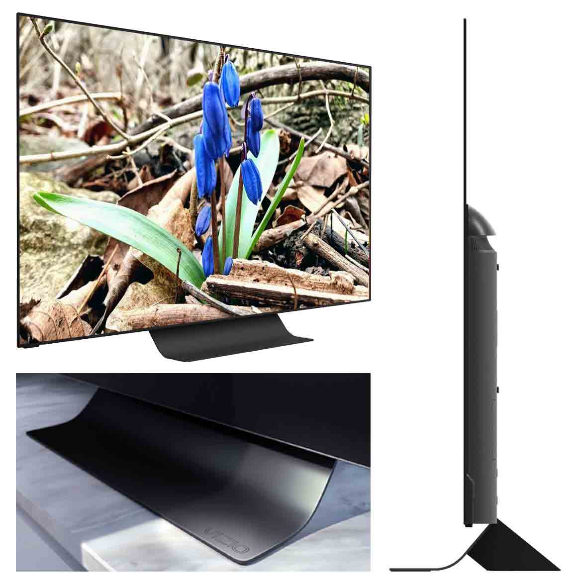 The relatively thin body of the OLED55-H1 TV is attached to a graceful platform in the center of the screen. The second part of the stand is installed on the back of the case. The main stand has a wave-like profile and looks slightly futuristic.