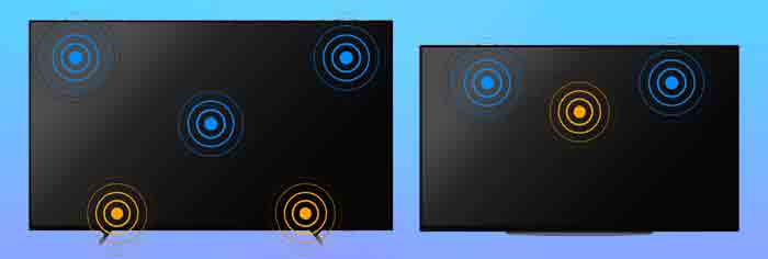 The second difference concerns the sound equipment of the new 4K OLED TVs. Both TVs have Acoustic Surface Audio + technology. It uses actuators that cause the display to vibrate and turn it into a loudspeaker, so to speak. In addition, there are flat subwoofers, which must support sound reproduction at low frequencies.
