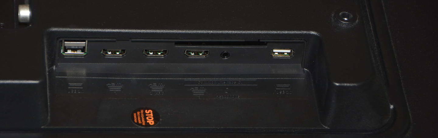 For wall mounting, it is better to choose the thinnest possible bracket for VESA 400×400 – there is no need to leave a gap for cable outlet at the back, all connectors are located in deep recesses close to the center of the panel. And for the same reason, you should immediately connect all possible cables and even an extension cable for USB, because you cannot blindly reach the connectors without hanging the TV to the wall.
