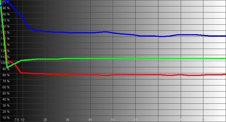 The names of the modes are clearly confused on the TV. When you select “Standard”, the maximum brightness is about 310 cd / m2, and when you select the “Sport” mode, which in theory should be brighter – 256 cd / m2. The black level is high in any case and does not fall below 0.138 cd / m2. That is, the limiting contrast ratio is 2246: 1 – a good result. In this case, the gradations are displayed correctly – the gamma is close to ideal.