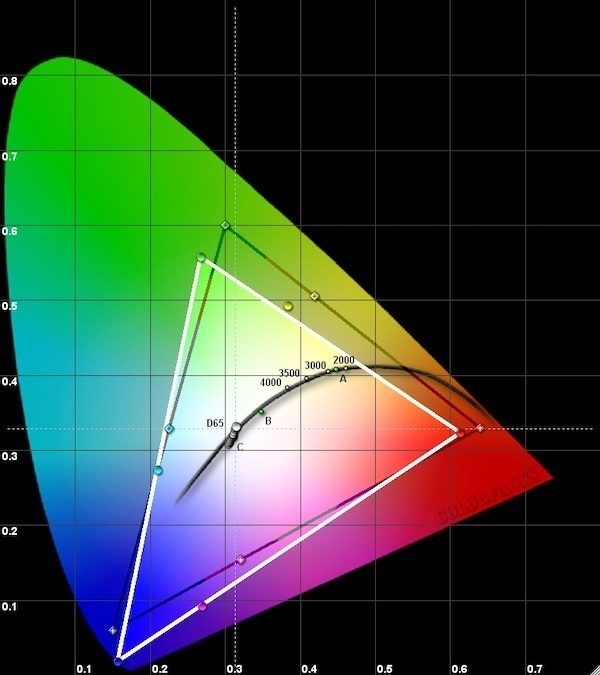 The visual setup of the projector is very good. Although you cannot say this based on the measurement results. Let’s say the maximum color gamut is similar to the Bt.709 standard and looks like this: