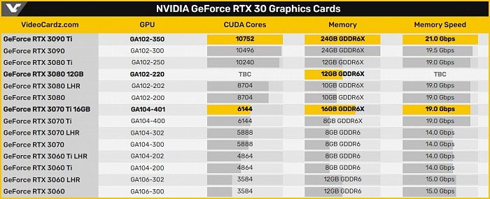 As far as we know, NVIDIA GeForce RTX 2060 12GB and RTX 3070 Ti 16GB should not receive any changes in the characteristics, apart from the increased amount of video memory. As for the GeForce RTX 3080 12GB, it is speculated that it is based on the GA102-220 GPU, which may affect the configuration.
